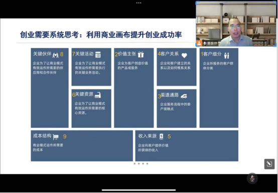 同时,葛振林先生还向我们讲述了如何利用商业画布提升创业成功率。商业画布分成九个部分,一是细分顾客,二是提供对应的价值主张,三是保持渠道通路畅通,四是保持良好客户关系,五是保证收入来源,六是核心资源竞争力,七是执行关键业务活动,八是抓牢关键伙伴,九是优化成本结构,以较低成本运作设定好的商业模式。除此之外,葛振林先生也向我们介绍了如何筛选好的创业方向,如何简化更关键的问题,最后强调“去尝试”才是验证一切的关键。