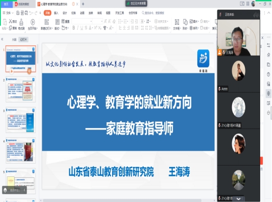 家庭教育关乎国家发展和民族未来,是当下社会的热点和焦点,家庭教育指导师是新纳入人社部《职业分类大典》的新型职业,也是心理学、教育学等专业学生的就业新方向和新选择。5月20日晚,我院王海涛老师为心理学、教育学专业学生进行家庭教育行业专题讲座,讲座以腾讯会议的方式举行。
