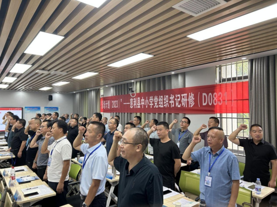 开班仪式在全体学员庄严的培训宣誓中拉下帷幕。本次培训为期七天,将采用专家讲座、案例分析、名校考察、行动学习等多种培训方式,帮助全体学员提升党建工作和教育管理能力,更好发挥中小学党组织战斗堡垒作用,落实立德树人根本任务,办人民满意的教育,助推农村教育高质量发展。