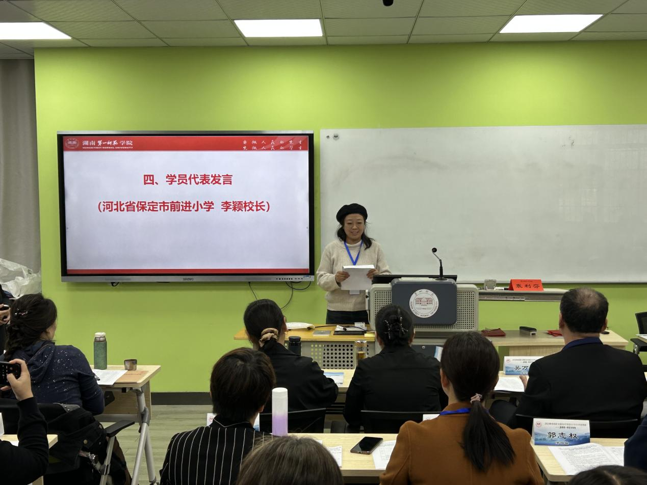 河北保定前进小学校长李颖作为学员代表发言,她在发言中表达了对承办方的诚挚感谢,并分享了对此次培训的期待。她表示,此次培训不仅是个人成长的宝贵机会,更是与各地同仁交流经验、共同进步的重要平台。她呼吁学员们珍惜机会,通过集中面授、影子培训、送教下乡、网络研修等多种形式,全面提升专业素养和管理能力,为学校的未来发展贡献力量。