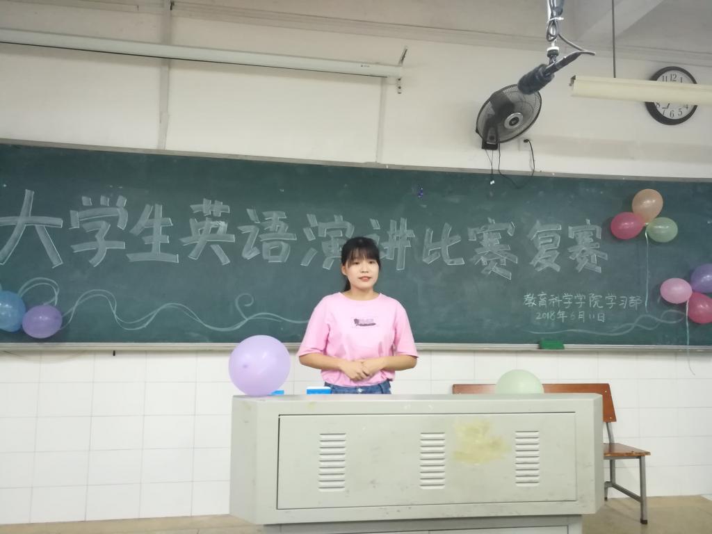 为营造我院英语学习气氛,丰富校园文化生活,6月11日晚,由教育科学学院团学会学习部主办的大学生英语演讲比赛于怀中楼南栋102、103教室成功举办。周慧、何明夜等9名学生担任此次比赛评委,共有60位同学参加了本次主题为China, a Global View的演讲比赛。