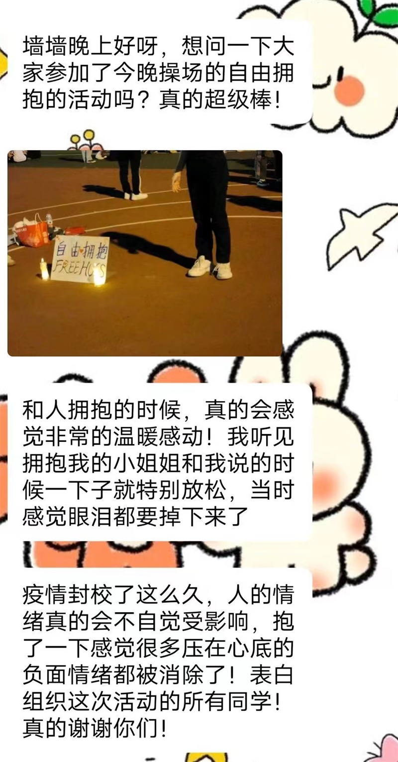 此次活动受到了同学们的一致好评,很多同学在活动后都反馈在这次“自由拥抱”的活动中感受到了温暖和力量。
