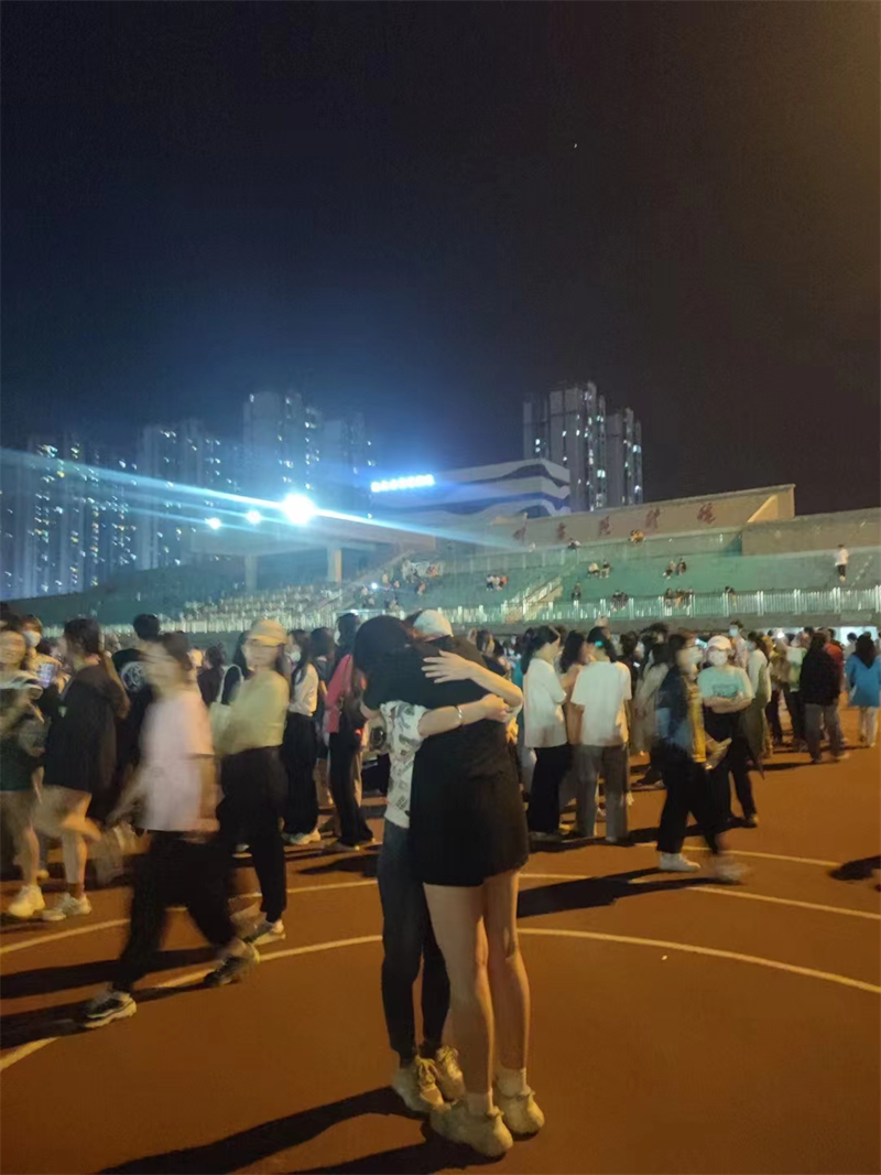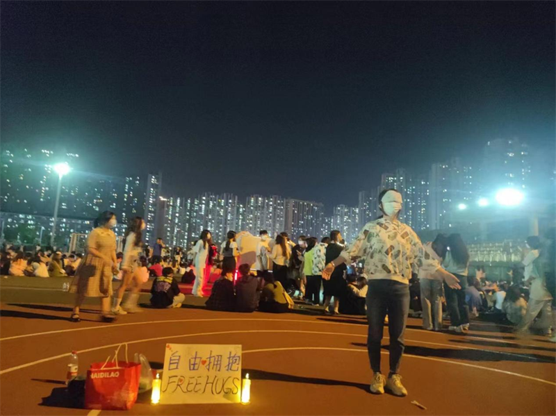 在4月8日晚上,在学校的田径场,很多同学参加了此次活动。活动准备了糖果和小零食,让同学们在拥抱彼此时,将糖果或者小零食送到对方手中。活动中,有很多同学收下糖果或小零食后带着十分灿烂的笑容说:“谢谢你!”。还有一些同学在拥抱后给被抱的人送小礼物、拍照。虽然田径场夜晚的灯光很暗,但是依然能够看到每一位同学笑容的灿烂。