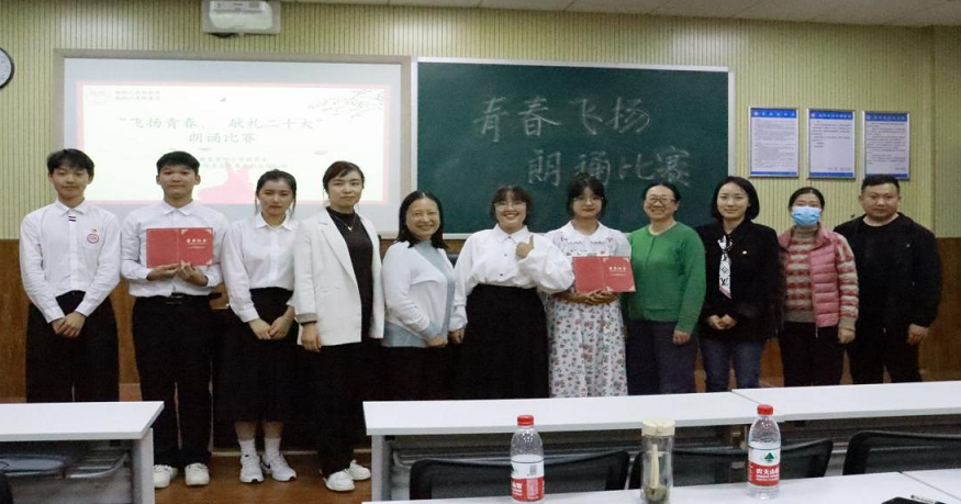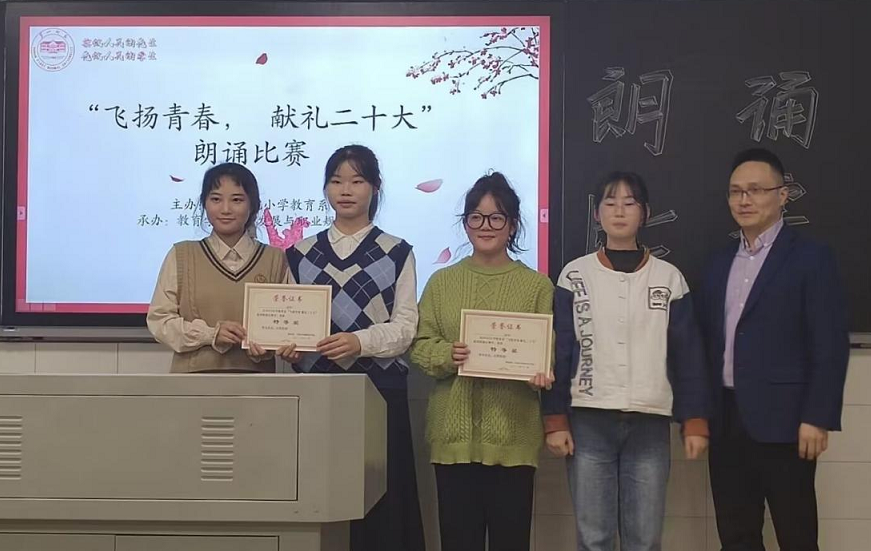 最终,经过评委老师们的层层考核,获特等奖节目名单如下:《诗颂风华》谢俊豪、姜昊佚、唐笑缤、黄莹,《冬天的麦苗上,看到中国的春天》朱莉荣获初招组特等奖;《祖国,一首唱不完的恋歌》朱丹丹、张雯毓,《与时代同向,与祖国同行》廖怡、郑婷文荣获高招组特等奖。评委老师为获奖选手们颁发了荣誉证书,并合影留念。至此,本次“飞扬青春,献礼二十大”朗诵比赛圆满落幕。此次比赛为教育学院小学教育专业大一全体学生提供了展示风采的交流与学习舞台,对提高我院尤其是小学教育专业学生的综合素质水平产生了积极作用。