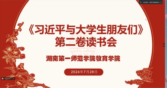 7月28日上午,教育学院组织开展《习近平与大学生朋友们》第二卷线上读书会,学院百余学生积极参与。读书会旨在增进大学生深入理解和认识习近平总书记关于青年工作重要论述。读书会由学院学生会主席团执行主席郑雅晴主持。
