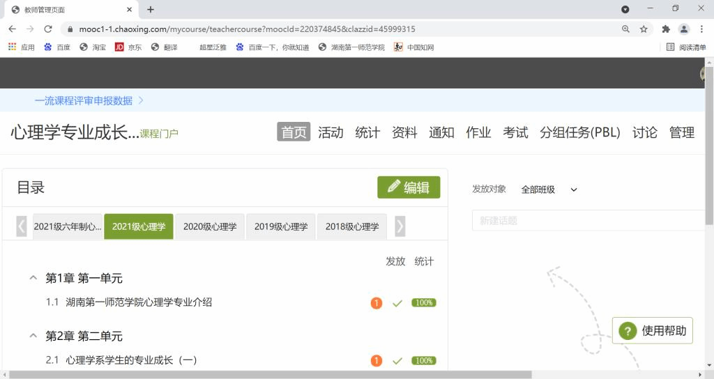 针对“线上”专业介绍,通过超星泛雅平台建立“心理学专业成长系列”课程,把2021年6月心理学教研室拍摄的心理学专业介绍视频以及盖笑松教授关于心理学专业成长的视频设定为任务点让学生自行学习。并且把心理学专业的在校学生(2018级、2019级和2020级)也分别建立班级,进行线上学习。