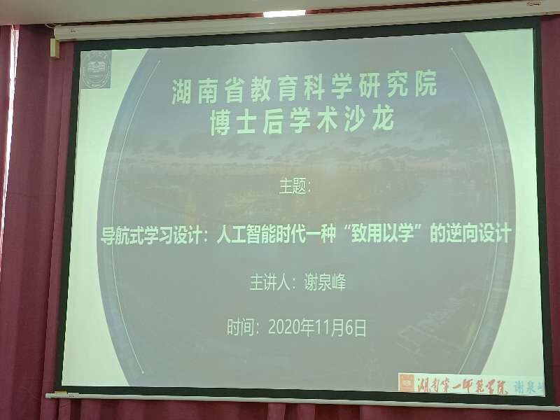 11月6日下午,湖南省教育科学研究院博士后学术沙龙活动在我校东方红校区怀中南208会议室举行。湖南省教科院博士后导师、省教科院博士后工作站首席专家、原湖南省教育厅厅长张放平教授,湖南省教科院博士后导师、湖南科技职业技术学院党委书记李三福教授,湖南省省教科院博士后合作导师、湖南师范大学博士导师刘要悟教授,湖南省教科院高教所副所长盛正发教授,湖南省教科院科研处处长毕树沙研究员,bevictor伟德官网副校长曹兴教授,bevictor伟德官网教育科学学院党总支陈天涯书记,bevictor伟德官网教育科学学院院长胡春光教授,湖南省教科院博士后工作站10余位博士后,教育科学学院部分教师和学生参加了本次沙龙活动。沙龙由湖南省教育科学研究院朱罗敬博士后主持,教育科学学院谢泉峰博士作“导航式学习设计:人工智能时代一种‘致用以学'的逆向设计”报告。