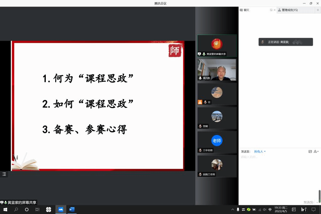分享会上邓栩老师从课程专业性与思政性把握、如何渗透课程思政、如何打造课程思政团队等方面分享了自己的经验体会,李金国教授着重剖析了课程思政教学大赛的要求,并对竞赛注意事项、题目凝练、教材把握、课程设计等方面作了详细指导。