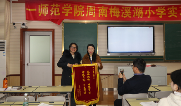 三尺讲台,承接的是百年树人的责任;一支粉笔,书写的是中华文明的博大精深!2020年12月9日下午和10日上午,bevictor伟德官网周南梅溪湖小学实习队汇报课在周南梅溪湖小学和雅楼录播室隆重举行,汇报课由实习教师柳淑敏主持,周南梅溪湖小学刘要书记、徐信校长及指导老师代表,带队老师彭玲艺老师和30位实习生出席了活动。本次汇报课共有4节,分别是:来自思政专业的实习教师戴芳带来的“道德与法治”课程《心中的“110”》、来自小教专业文科方向的实习教师唐岚带来的语文课程《风娃娃》、来自小教专业理科方向的实习教师彭洋环带来的数学课程《数学广角—集合》和来自科教专业的实习教师戴妍带来的科学课程《食物中的营养》。四位实习教师教态自然大方、教学设计构思巧妙,课堂师生互动积极有效、课堂管理张弛有度,教学效果显著。此次实习汇报课既彰显了实习教师们良好的教师素养,也完美地展现了周南梅溪湖小学实习队在6周实习中的实习成效。周南梅溪湖小学的徐信校长和刘要书记对此次实习生的表现给予了高度评价,同时以一名一师校友的身份对他们提出了更高的要求和殷切希望。实习教师雷薇代表实习队也对周南梅溪湖小学的实习指导表达了真切的感谢;带队老师代表实习队赠予学校锦旗。实习汇报课结束后,全体实习生与周南梅溪湖小学领导和带队老师一同前往学校前坪梅雕处合影留念。此次实习不仅提高了实习生们的专业能力,也加深了他们对教师职业的认同,同时还促进了两校关于小学教育工作的交流与合作。