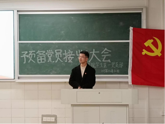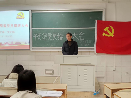 12月10日晚,教育学院学生第一党支部在玉衡楼106教室举行预备党员接收大会,讨论关于吴兰瑛等八名同志接收为中共预备党员的事宜。院党委副书记张志新、学工办主任杨杨、支部书记邓魁及支部全体党员25人参加会议,会议由支部党员鲍习甜同志主持。