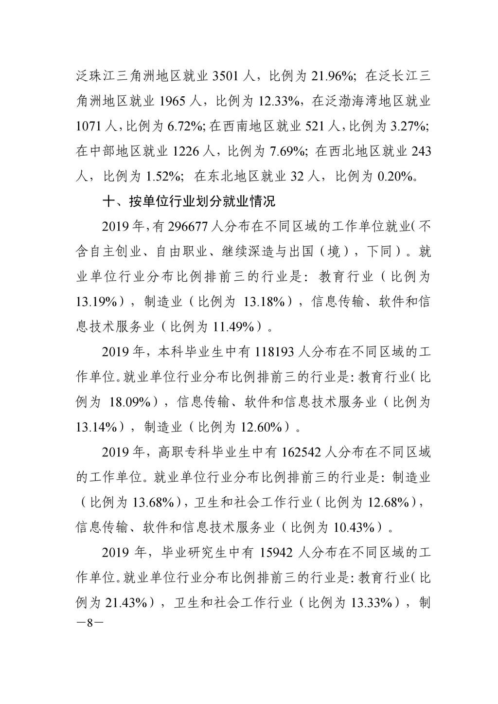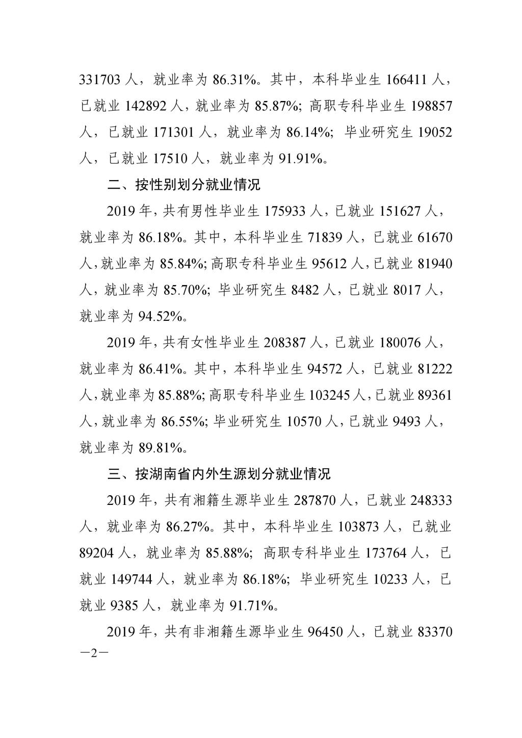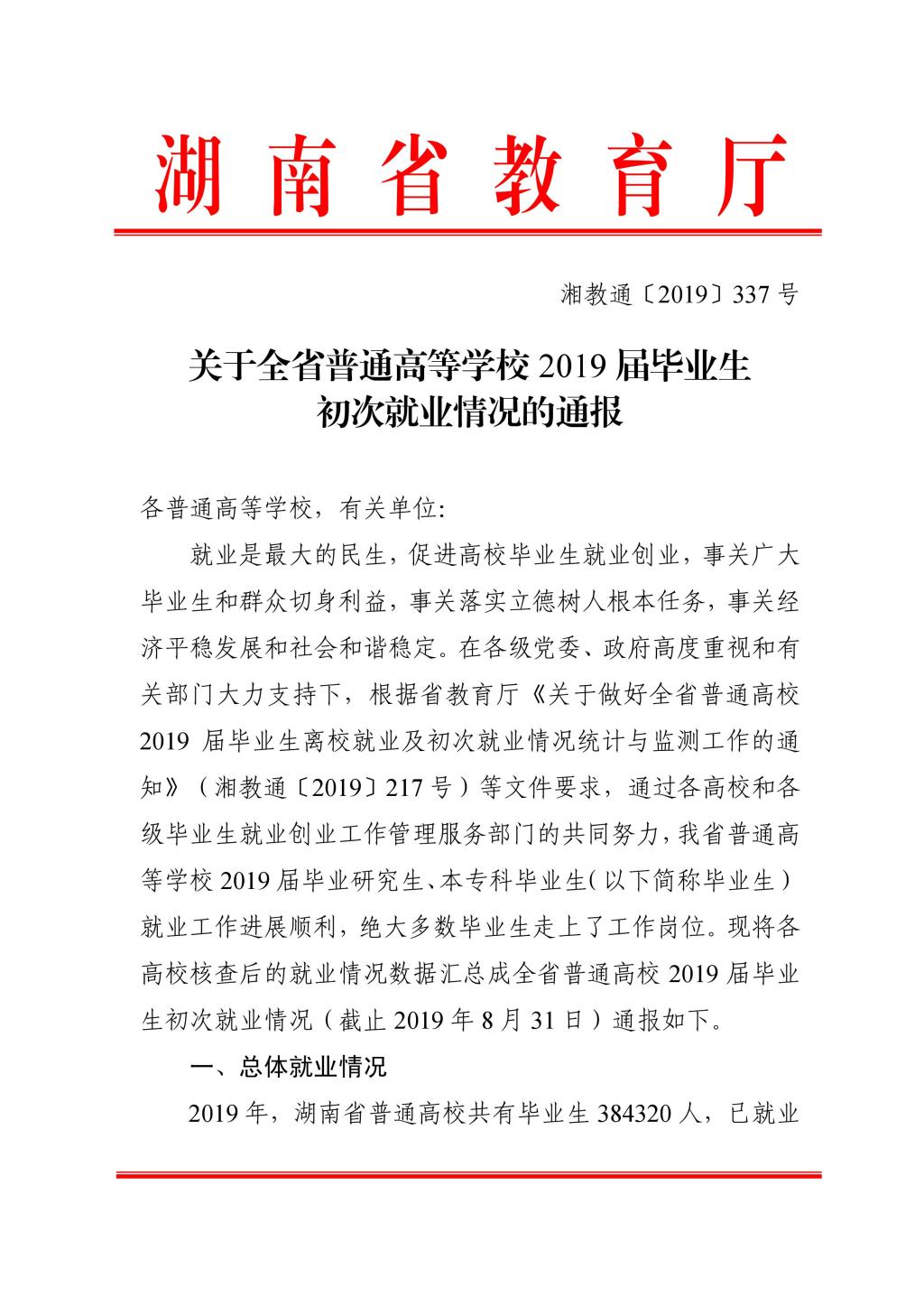 湘教通〔2019〕337号 关于全省普通高等学校2019届毕业生初次就业情况的通报