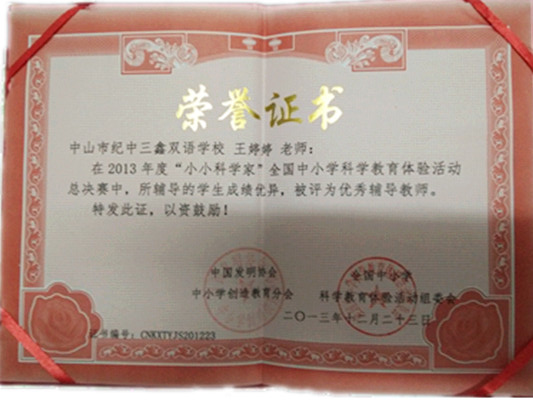 第四,培养学生科学研究能力。2013年,指导学生参加全国第二届“小小科学家”活动,在全国总决赛中获一等奖3项,二等奖5项,三等奖8项。个人被评为“优秀辅导老师”。