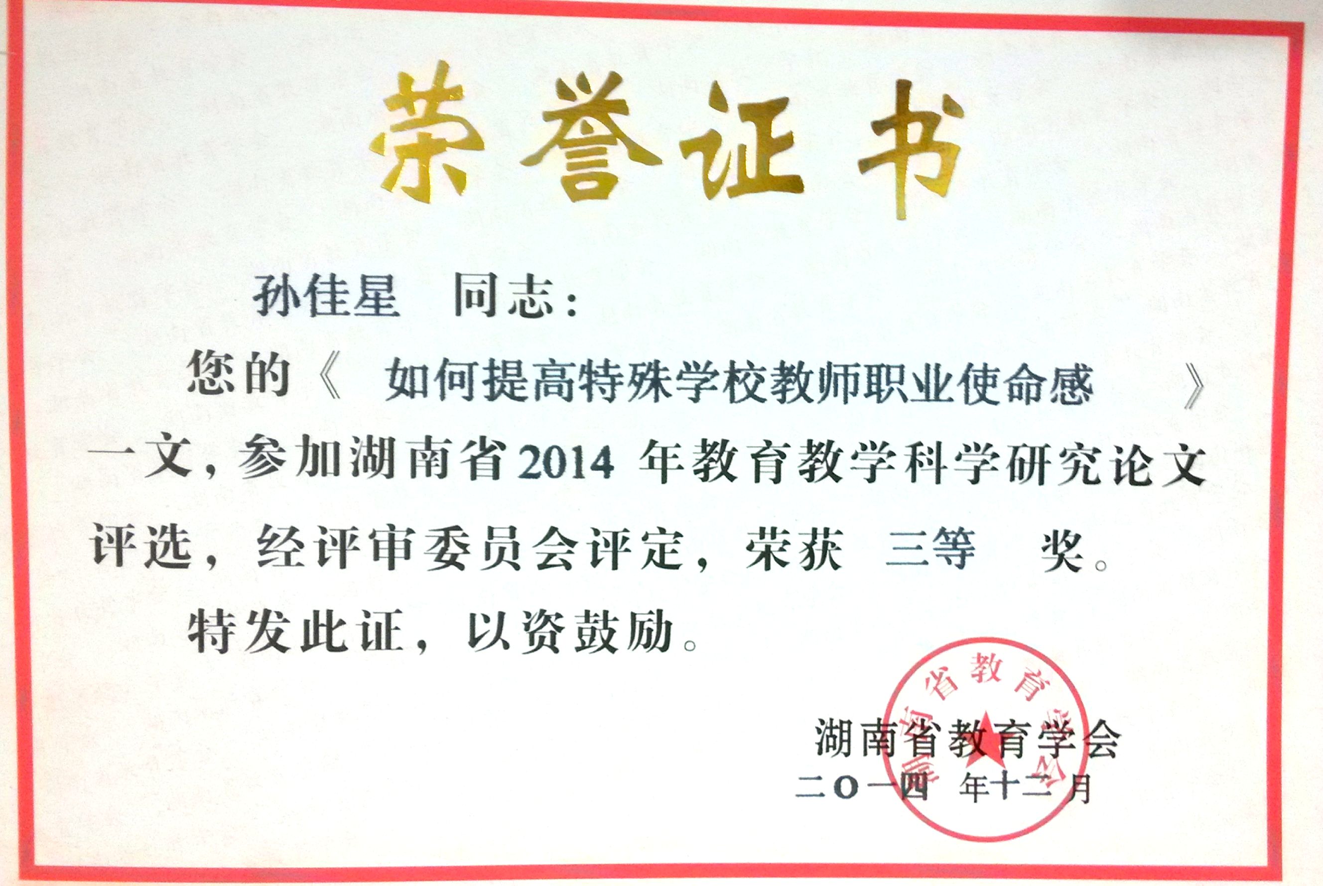 2014年撰写的论文《如何提高特殊学校教师职业使命感》获湖南省三等奖