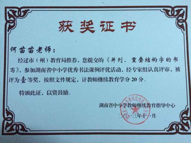 2013年《并列、重叠字的书写》获湖南省中小学优秀书法课例一等奖