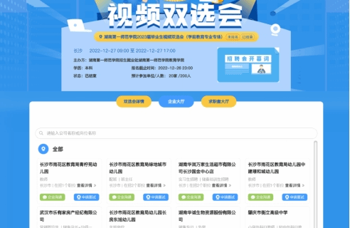 12月27日,我院举行2023届毕业生学前教育专业专场视频双选会。受疫情影响,此次视频双选会线上举行。参加此次视频双选会有省人民政府直属机关第二幼儿院、长沙市雨花区教育局青柠苑幼儿园等24家招聘单位,学院100余名毕业生参加应聘。