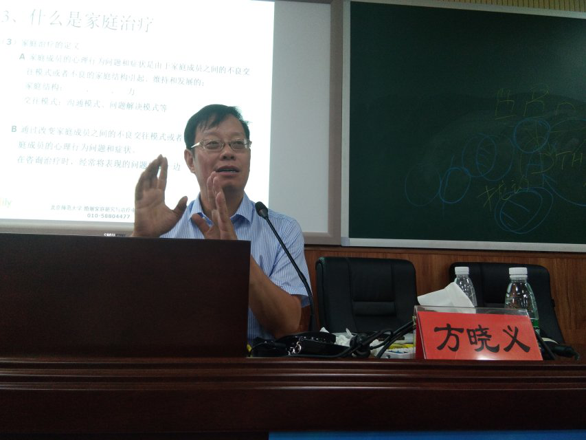 8月15日上午,北京师范大学博士生导师、教育部长江学者特聘教授、教育部社会科学委员会教育学和心理学学部秘书长、中国心理学会发展心理学分会主任委员、中国教育学会学校教育心理学分会理事长方晓义教授, 在我校科技楼教学研讨与观摩室作题为“家庭治疗——改变儿童青少年心理行为问题的新方法”的精彩讲座。讲座由教育科学学院朱丹老师主持,2018“国培计划”——湖南省首批家庭教育讲师团递进式研修班70名学员参加了讲座。