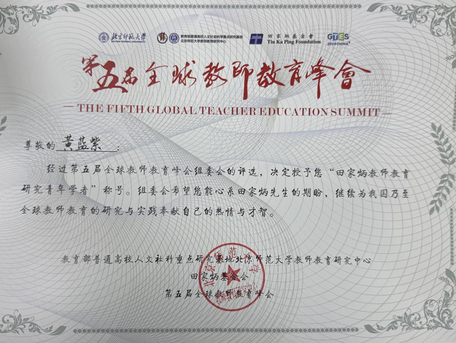 10月25—28日,第五届全球教师教育峰会(Global Teacher Education Summit,简称GTES)在北京召开。我院副教授黄蓝紫博士应邀作为分会场主持人和汇报人参加会议。同时,被授予“田家炳教师教育研究青年学者”称号。