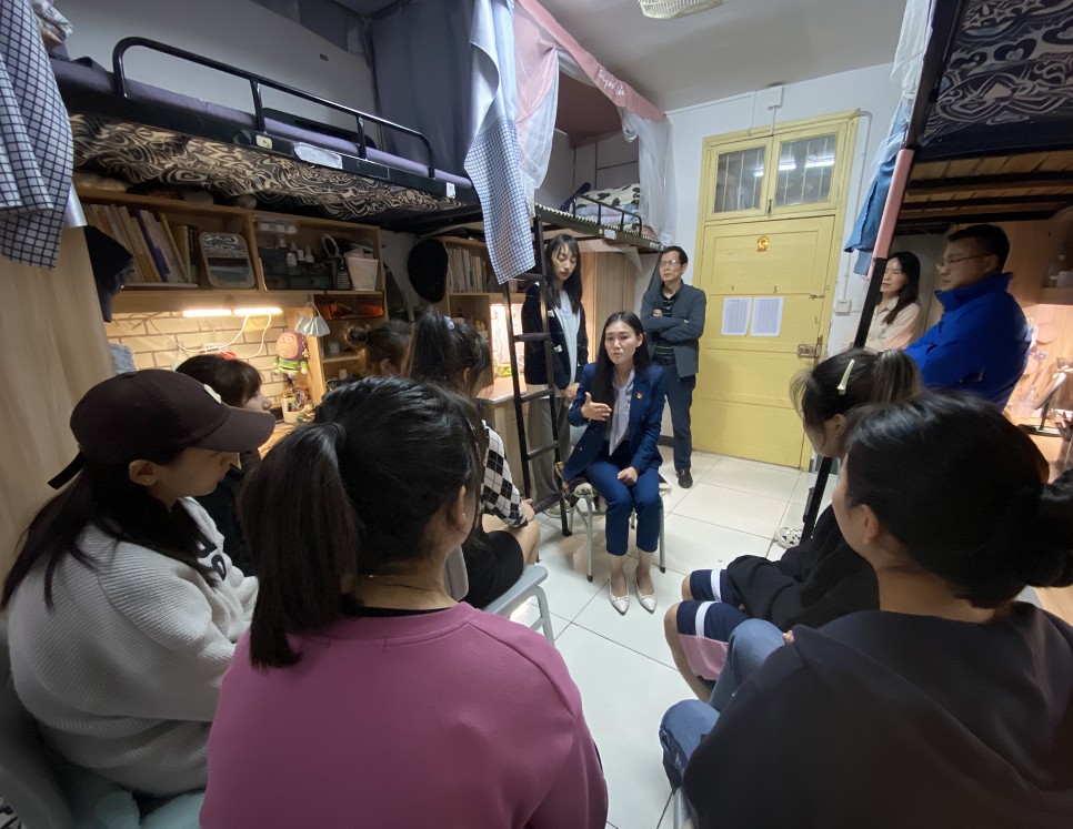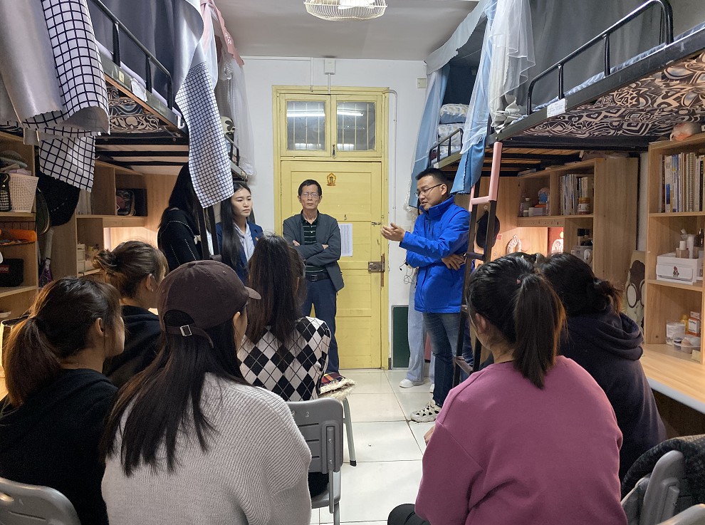 4月25日晚,教育学院党委副书记张志新,学工办主任刘军,团委书记孙三元和全体辅导员来到1栋和2栋寝室开展思政座谈会。
