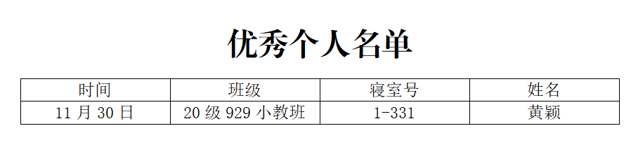 查寝过程中,学生检查人员根据实际情况,严格按照统一的评分标准对各寝室进行评选。现将“优秀寝室名单”“优秀个人名单”“不合格寝室名单”“需整改寝室名单”公示如下: