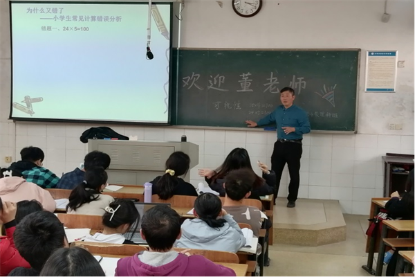 2021年11月18日下午,我院邀请了省级特级教师董建军老师在怀中南301为我院小学教育专业19小教理1-2班的学生开展了题为“小学数学教材深度解析与课堂教学实践”的讲座。讲座由小学教育专业学科专业负责人谢立红老师主持,实习带队老师彭玲艺和小学教育教研室李阳老师全程参与聆听。