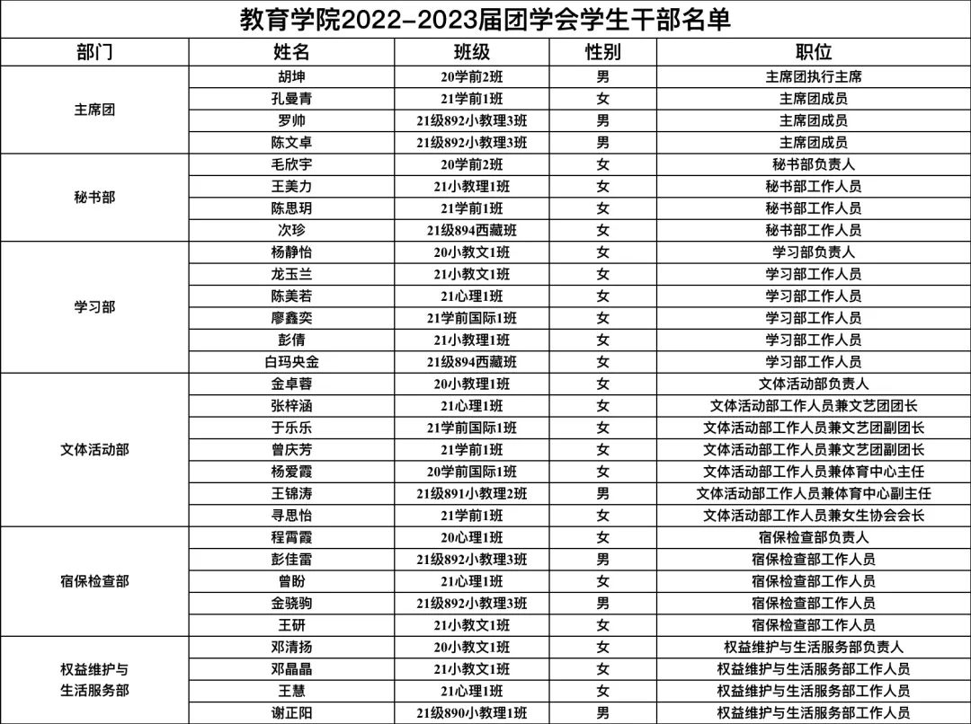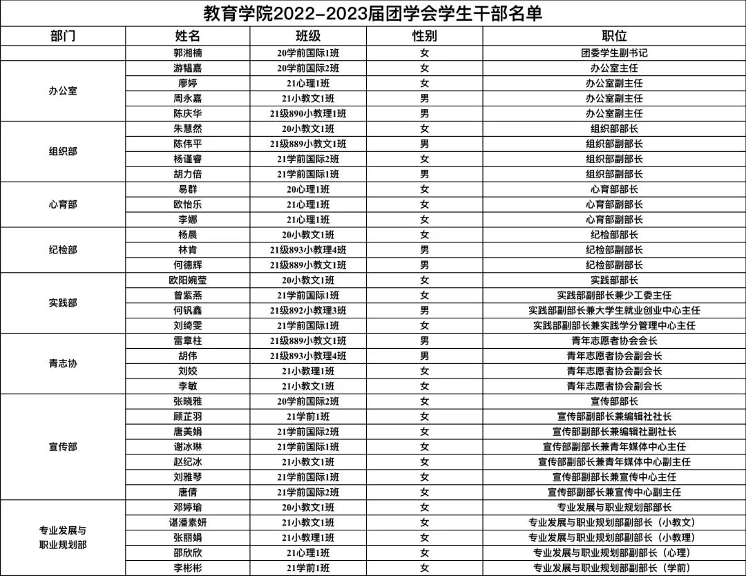 经个人申请、初试与复试、竞职演讲和院部考察,综合研究决定,拟同意以下同学为教育学院2022-2023届团学会学生干部,现公示如下: