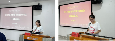 教育学院2023级硕士研究生彭缘芳、2024级硕士研究生何样分别作为老生代表和新生代表进行发言。老生代表彭缘芳同学鼓励研究生新生要在学术和品德上有双重追求。在校期间,要珍惜时光,努力学习,通过立足于学校深厚的历史底蕴来追求卓越,争取为社会做出贡献。新生代表何样同学首先对学校为新生提供的丰富的学术科研资源、充足的成长机会表达了感谢,同时,也向辛勤工作的老师们表达了敬意。其次,她也抒发了对研究生学习生活的憧憬与期待。