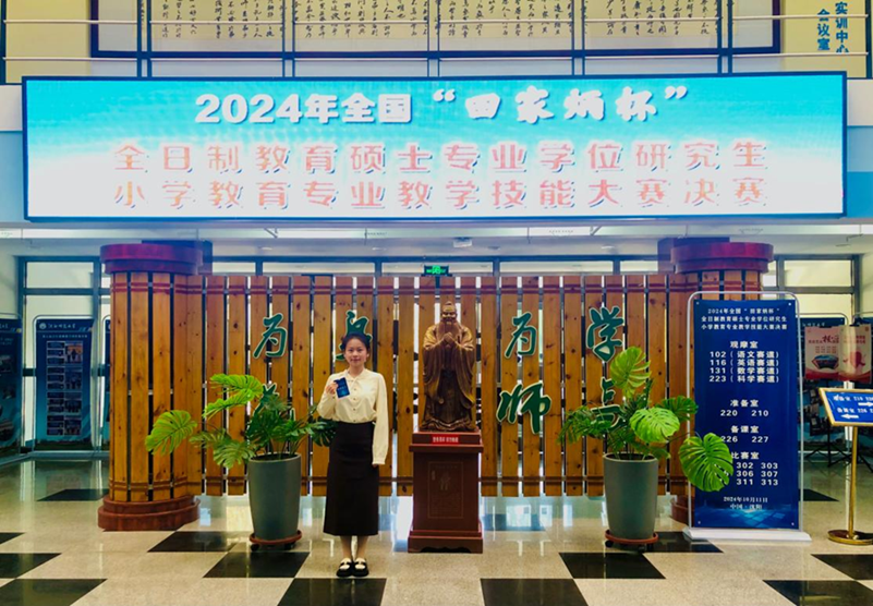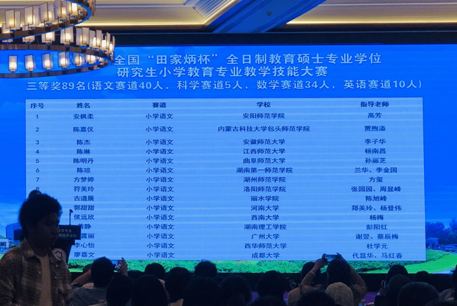 2024年10月12日,2024年全国“田家炳杯”全日制教育硕士专业学位研究生(小学教育领域)教学技能大赛在沈阳师范大学圆满落幕。经过激烈角逐,教育学院2023级小学教育专业联培研究生陈琼代表学校荣获三等奖。