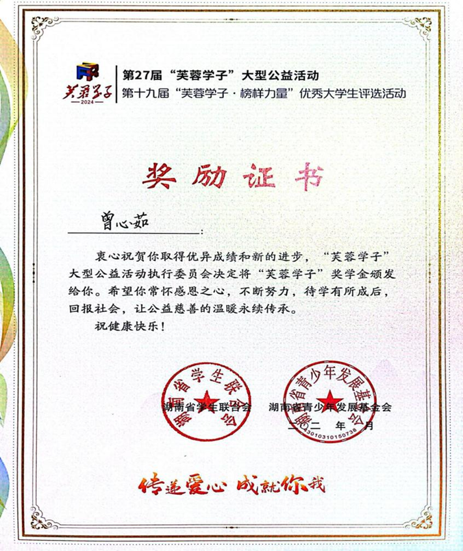 退伍不褪色,校园续华章 ——教育学院曾心茹同学荣获“芙蓉学子,榜样力量”自强不息奖